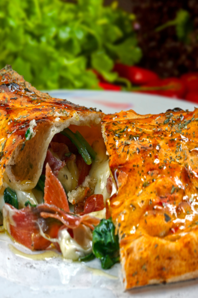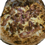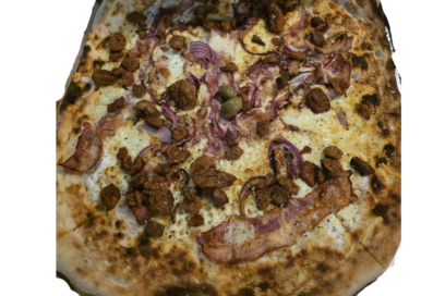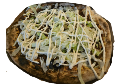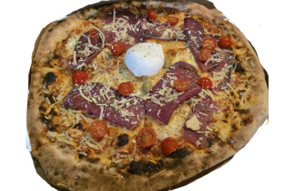 12 / 21 €Kiselo vrhnje, mozzarela, edamer, špek, čvarci, ljubičasti luk, jaje, maslina, origano