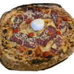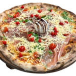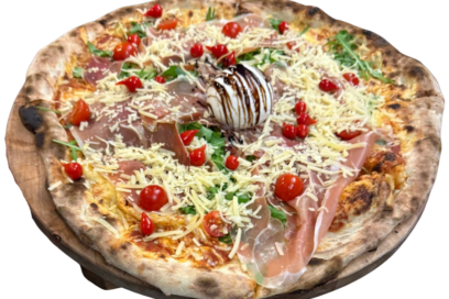 14€Pelat, mozzarela, edamer, pršut, rikola, cherry, pepper drops, burrata, grana padano, maslina, origano